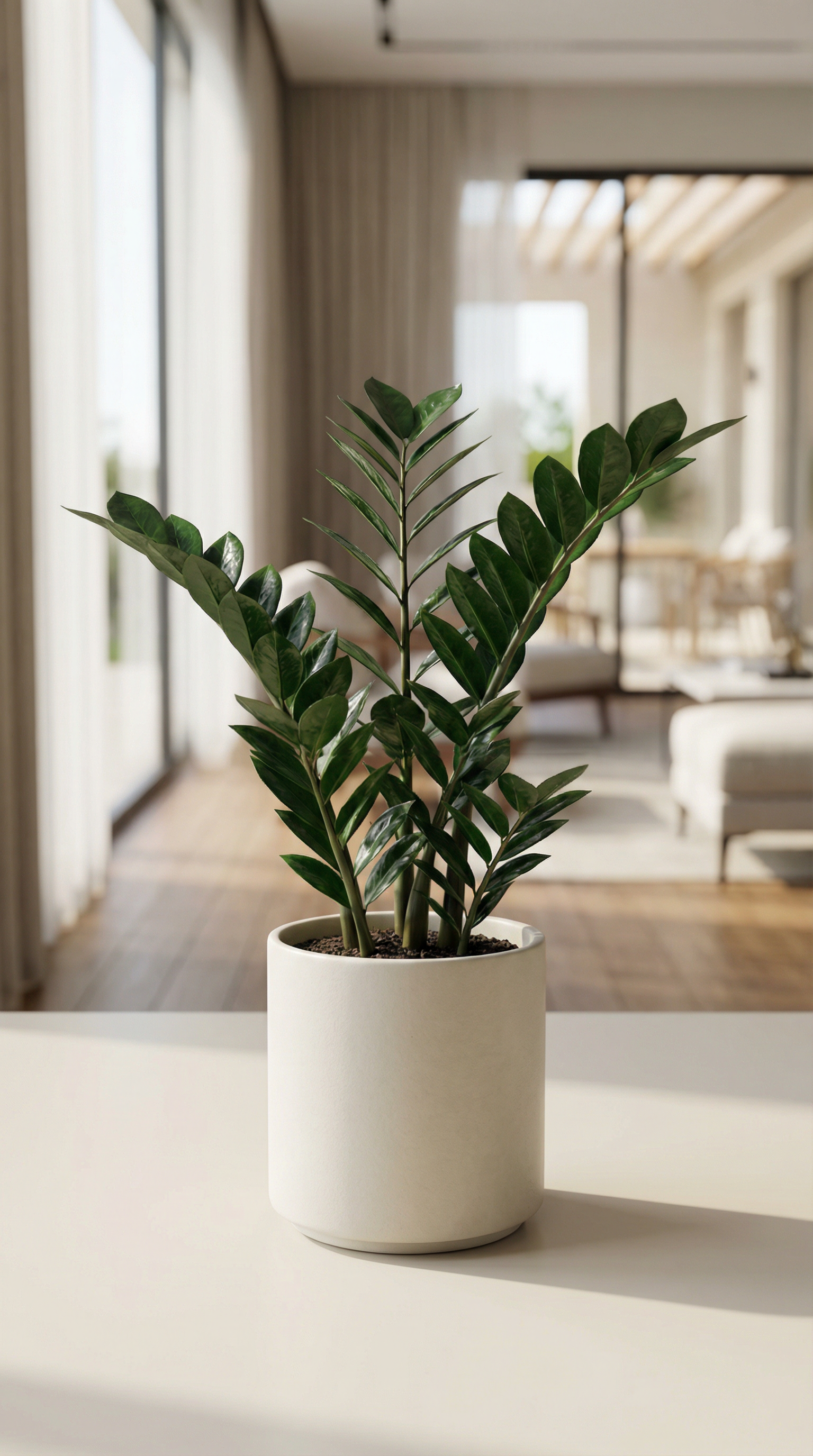 The ZZ plant (Zamioculcas zamiifolia) is a tropical perennial distinguished by its compound pinnate leaves and exceptional drought tolerance. This specimen excels in low to moderate indirect light and requires infrequent watering, making it botanically suited for diverse indoor environments. Its rhizomatous root system stores moisture efficiently, reducing maintenance demands while supporting sustained growth. The plant demonstrates documented air-purifying capabilities and exhibits slow, controlled development. An exemplary choice for those seeking reliable, long-lived foliage with minimal horticultural intervention.